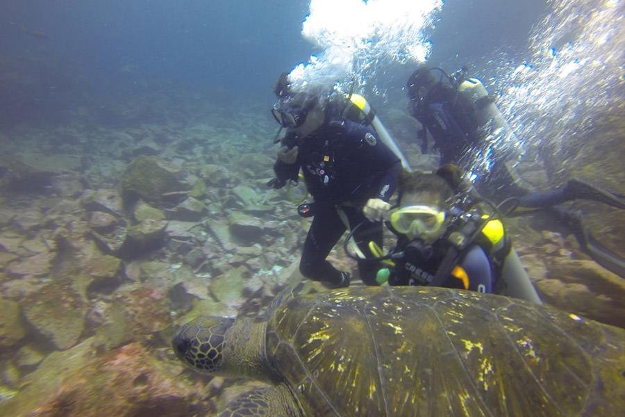 Al llegar, los instructores certificados preparan el equipo para la primera inmersión, explorando acantilados y túneles submarinos donde se encuentran tiburones martillo, tiburones de Galápagos, rayas, tortugas marinas y bancos de peces tropicales. Tras esta primera inmersión, se realiza un breve descanso a bordo con snack y frutas.